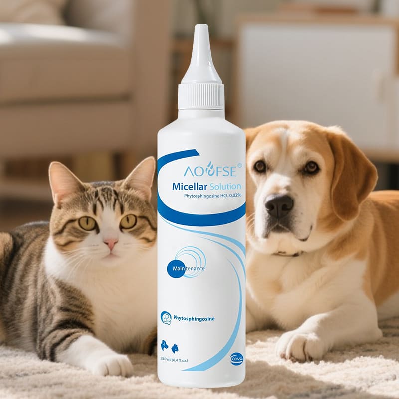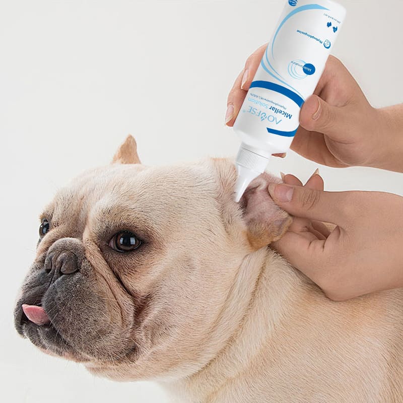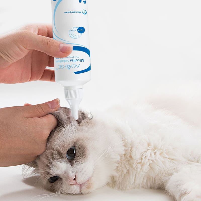 Wholesale micellar ear cleansing solution for dogs and cats. Non-irritating pet ear cleaner with phytosphingosine. OEM/ODM private label manufacturer for pet care brands.